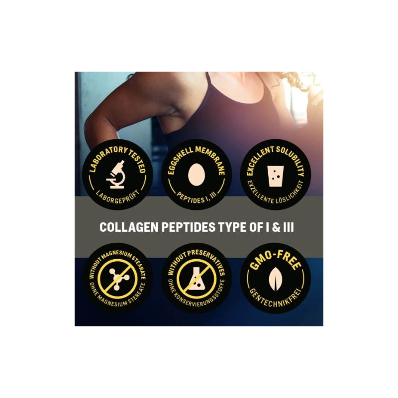 Obsahuje kolagenní peptidy typu I a III. Může obsahovat mléko, vejce, obiloviny obsahující lepek, soju, arašídy, skořápkové plody, ryby a korýše.